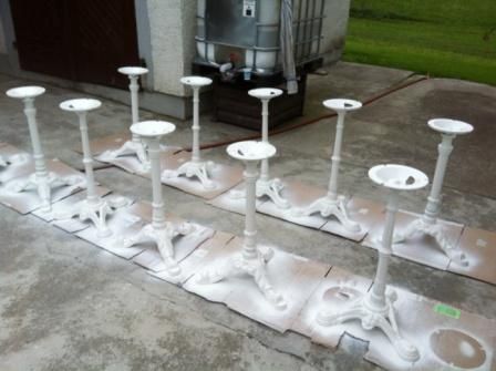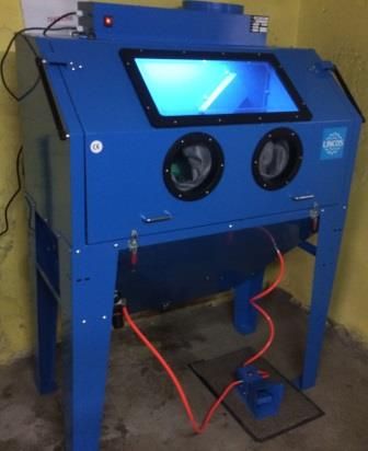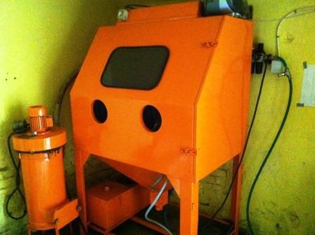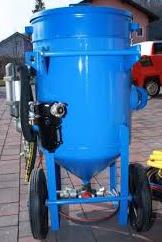 Peskanje s tlačnim peskalnim strojem kapacitete 100 kg. Lahko peskamo večje predmete na prostem.